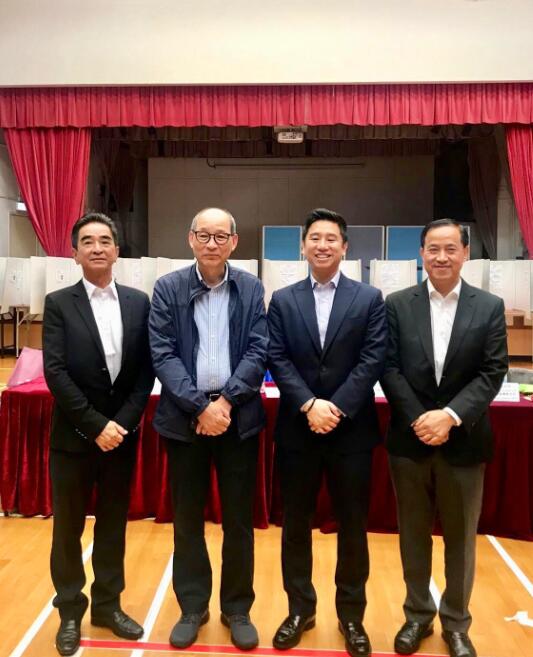 林奕權(quán) (右二) 當(dāng)選第 22屆大埔鄉(xiāng)委會主席,前輩張學(xué)明(左二)、 首副主席陳笑權(quán)(右一) 及副主席張國棟(左一)同祝賀。