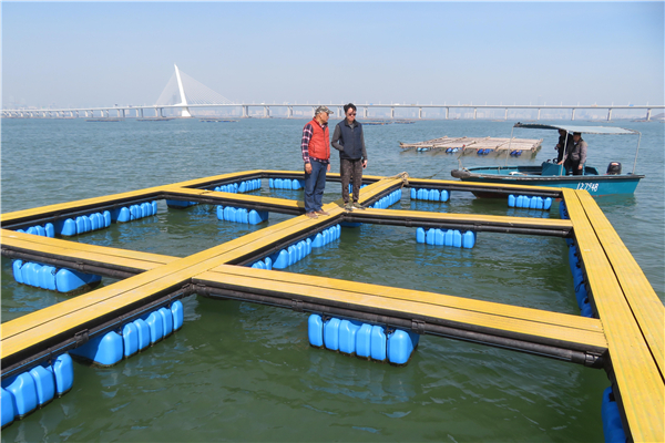 記者跟隨粵港水產(chǎn)科技養(yǎng)殖協(xié)會(huì)人員出后海灣視察蠔排情況,右二為主席陳偉強(qiáng)。