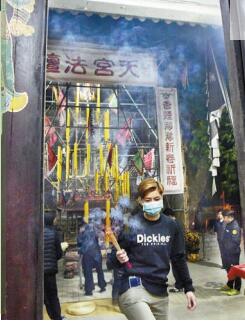 善信戴口罩上香。