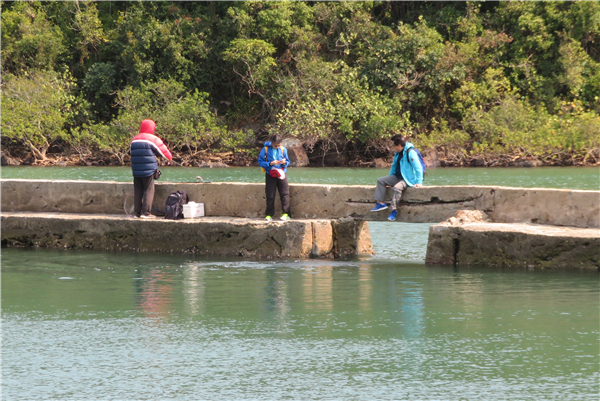 石屎堤圍是包圍著曝罟灣的,北邊堤圍及西堤圍是起點也是終點,看你從哪裏進入。這裏實屬鹹淡水交界之地,岸邊有不少紅樹林。很多年前,村民建造堤圍,用來養(yǎng)魚,小海灣變成小魚塘。從名稱看,「罟」是漁網(wǎng),還要經(jīng)常曝曬,可想像昔年這裏是漁業(yè)之地。不過隨村民的遷離,曝罟灣這個蓄水大魚池已荒廢半個世紀。堤圍的缺口實質(zhì)是3道閘口,以控制海水進出及閘魚,但其功能早已喪失,灣內(nèi)早已是海水了。其中一個缺口,經(jīng)過前年的颱風「山竹」蹂躪後崩塌,幸經(jīng)有心人用鐵枝搭建了過渡,走過時安穩(wěn)。另外兩個缺口,相連石壆寬度只有約一個成年人身位,其下是海水,有人藝高人膽大,很快就大步走過,但更多人是以策安全,以側(cè)坐或正坐方式,慢慢移過去。
