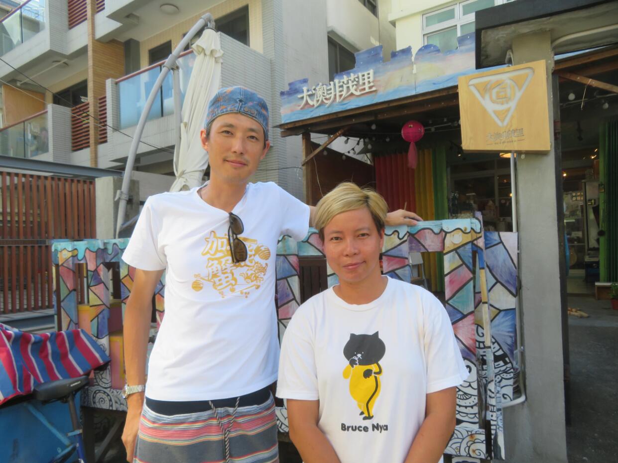 Queenie與貝貝在大澳童年壁畫前扮鬼扮馬。 記者 鄭玉君攝