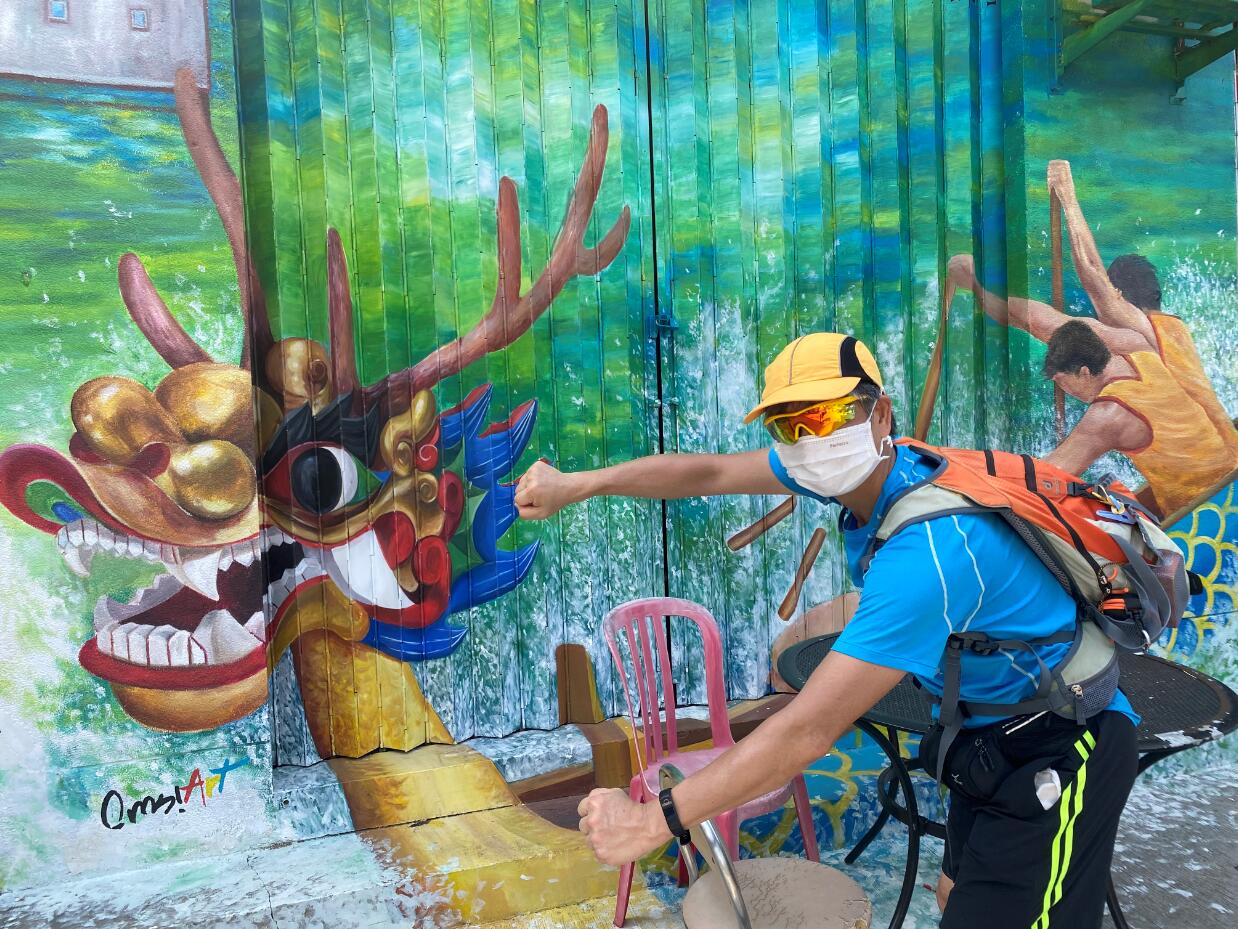 大澳壁畫近來成為打卡熱點,它亦成為打卡團的重要內(nèi)容,教你如何拍出獨特角度。在大澳鄉(xiāng)事委員會廣場的橫水渡壁畫包含地畫,它既長且闊,要整幅拍下來兼人在橫水渡,這種個人照不夠特出,Ivan說可以嘗試拍攝分身壁畫,就是用手機的全景拍攝方法,這樣相片會出現(xiàn)兩三個的你站立在不同位置,很有趣。