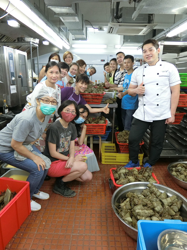 是次製作的愛心糭數(shù)目是歷年最多,幸得到好多義工支持。白衣者為孫家榮師傅。
