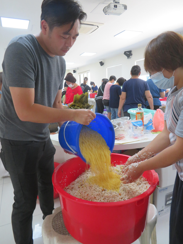 坑口鄉(xiāng)事委員會主席劉啟康表示,以往坑口各村落會自己包粽迎佳節(jié),不過去年首度嘗試召集村民,在鄉(xiāng)委會的會議室齊齊包粽,期望活動可凝聚區(qū)內(nèi)十八條村,結(jié)果有30多名義工村民參與,包紮的2000隻粽十分受歡迎,千名坑口村落長者受惠。今年受疫情影響,這麼多人聚集的活動根本難以舉行,幸端午節(jié)前一周放寬限聚人數(shù),這樣製作時間則較緊迫,「4日時間搞掂曬,首日剪竹葉,第二日清洗竹葉、炒蝦米、醃豬腩肉,第三日全力包粽、烚粽、分派部分村落,第四日派粽」,但過程十分順利。