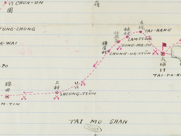 六日戰(zhàn)爭的關(guān)鍵人物時(shí)任輔政司駱克,其珍藏中有親手繪的平定新界村民衝突路線圖(局部),交叉符號(hào)為發(fā)生衝突的位置,可見在大埔墟至錦田之間有多場(chǎng)打鬥。香港歷史博物館提供圖片