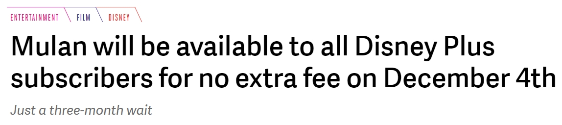 從影片首次上映到向普通訂戶開放之間只有三個(gè)月,《花木蘭》是迪士尼歷史上窗口期最短的影片之一。通常一部電影從院線上映到Disney+需要好幾個(gè)月的時(shí)間。