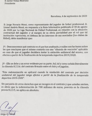 阿根廷球星萊昂內(nèi)爾·梅西5日宣布,他將在接下來的2020-21賽季繼續(xù)留在自己目前效力的巴塞羅那足球俱樂部,原因是不希望與俱樂部對簿公堂。此前梅西通過傳真方式告知巴塞羅那俱樂部自己希望能夠離開,但西甲聯(lián)盟方面在當(dāng)?shù)貢r間8月30日發(fā)布聲明稱梅西與巴塞羅那的合同仍然有效,合同中包含一項解約條款,如果球員沒有支付解約條款中的相關(guān)費(fèi)用,西甲聯(lián)盟將不會為球員解約提供證明手續(xù)。