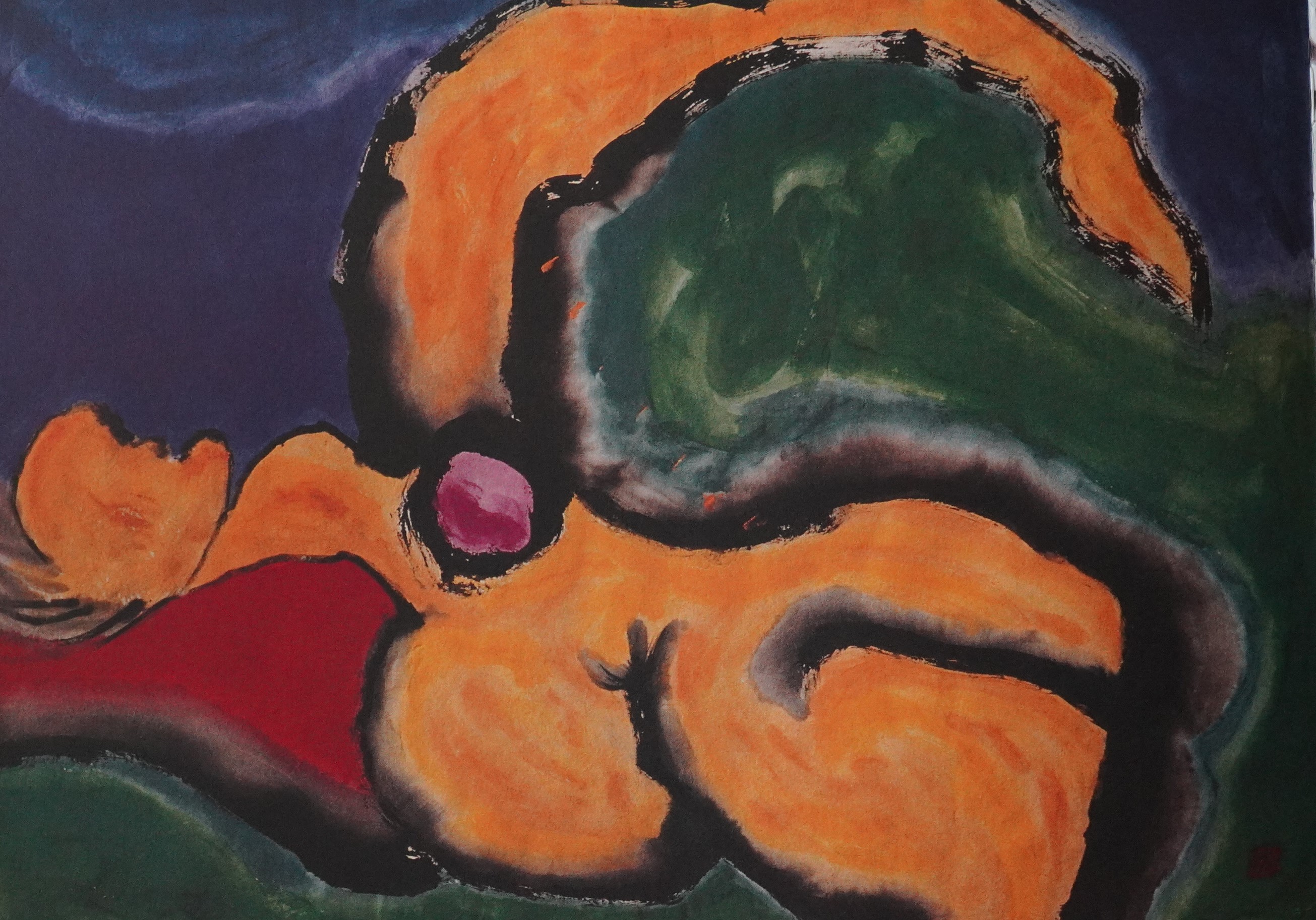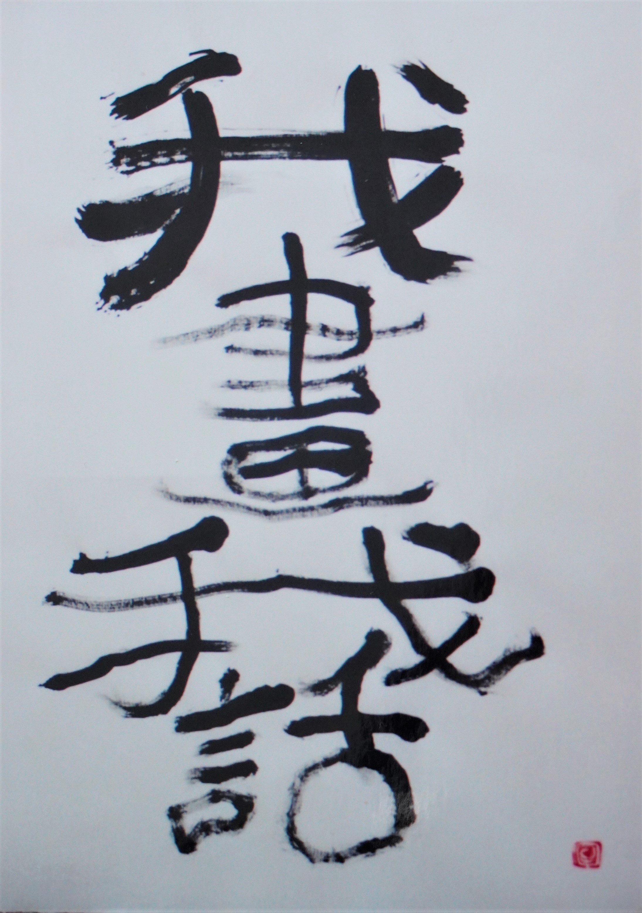 縱使能寫能畫,廖東梅坦言有些題材是自己難以駕馭的,如具象畫,亦一如其他畫家般曾面臨創(chuàng)作困境。由於她下筆時(shí)要控制自己,控制顫抖不聽使喚的手,所以她擅長(zhǎng)繪寫大線條的抽象作品?!肝以竭^日本學(xué)習(xí)書法,日本書法不單止大,且講究『氣』,當(dāng)?shù)乩蠋熣J(rèn)為我的書法線條有力量感及矛盾感,遂將畫室內(nèi)最大的毛筆給我書寫?!箯娜毡緦W(xué)成歸來沒多久,廖東梅便接到為「稻鄉(xiāng)飲食文化博物館」作畫的工作,圍繞該集團(tuán)「?jìng)魇跒楸尽?、「團(tuán)隊(duì)為基」、「昇華信仰」、「忍耐至上」和「共享收穫」5個(gè)理念,繪畫5幅作品。這對(duì)廖東梅來說頗有難度,她認(rèn)為難以用繪畫表達(dá)5個(gè)主題??嗨剂季茫艣Q定用既代表文字又代表圖案的甲骨文創(chuàng)作,發(fā)揮書法的優(yōu)點(diǎn)。如代表「昇華信仰」的「神」字,看似精簡(jiǎn)勾畫的黑線,予人強(qiáng)而有力之感,配上鮮豔的色彩,更有中西融合的效果。