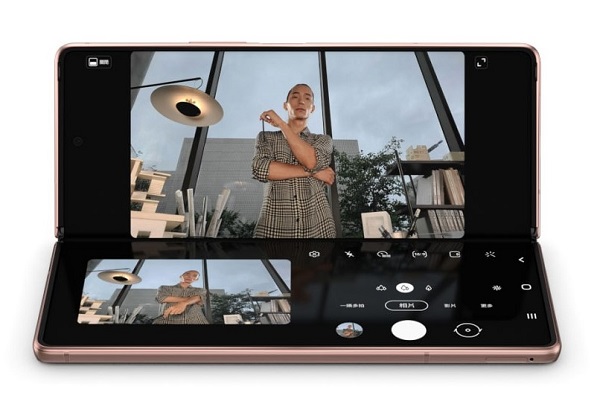 當(dāng)手機(jī)摺疊時(shí),相機(jī)應(yīng)用程式會(huì)將屏幕畫面一分為二,上面是預(yù)覽部分,下面為操控部分。