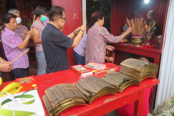 村民魚貫上香祈神恩庇佑,圖前方為寫了祝福語(yǔ)的鍍金瓦片。