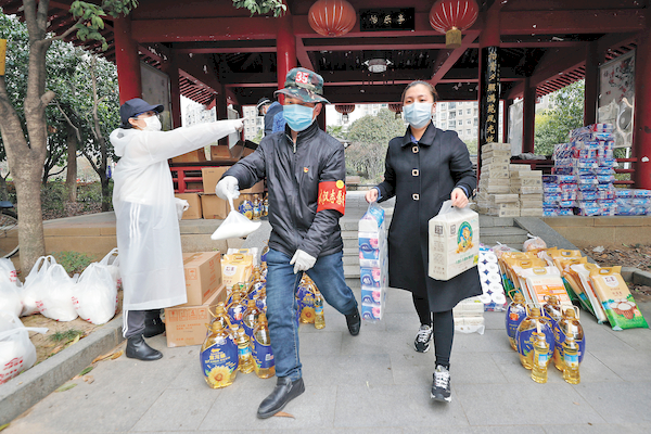 2月24日,武漢百步亭工作人員配送居民團購貨品。資料圖片