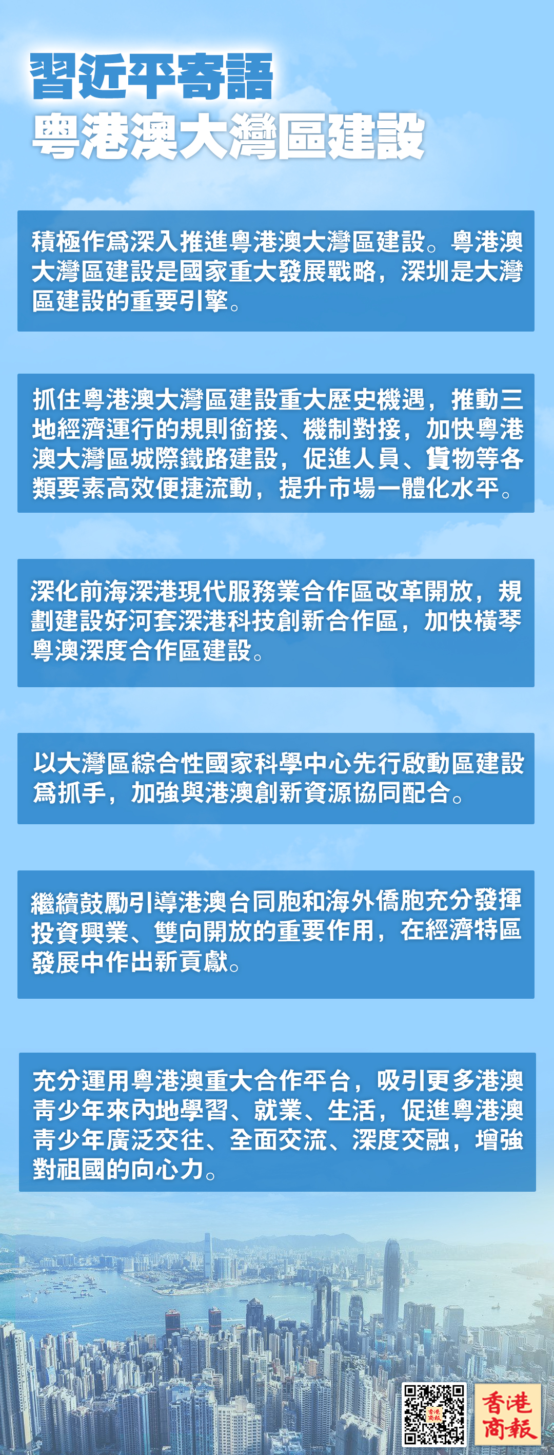 習近平說,粵港澳大灣區(qū)建設是國家重大發(fā)展戰(zhàn)略,深圳是大灣區(qū)建設的重要引擎。要抓住粵港澳大灣區(qū)建設重大歷史機遇,推動三地經濟運行的規(guī)則銜接、機制對接,加快粵港澳大灣區(qū)城際鐵路建設,促進人員、貨物等各類要素高效便捷流動,提升市場一體化水平。要深化前海深港現(xiàn)代服務業(yè)合作區(qū)改革開放,規(guī)劃建設好河套深港科技創(chuàng)新合作區(qū),加快橫琴粵澳深度合作區(qū)建設。要以大灣區(qū)綜合性國家科學中心先行啟動區(qū)建設為抓手,加強與港澳創(chuàng)新資源協(xié)同配合。要繼續(xù)鼓勵引導港澳臺同胞和海外僑胞充分發(fā)揮投資興業(yè)、雙向開放的重要作用,在經濟特區(qū)發(fā)展中作出新貢獻。要充分運用粵港澳重大合作平臺,吸引更多港澳青少年來內地學習、就業(yè)、生活,促進粵港澳青少年廣泛交往、全面交流、深度交融,增強對祖國的向心力。