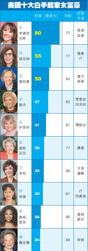福布斯美國(guó)白手起家女富豪榜一年發(fā)布一次,今年是第六期。上榜者均來自於美國(guó),都是白手起家的女性富豪。她們當(dāng)中包括創(chuàng)業(yè)企業(yè)家、公司高管、演藝家等。今年合計(jì)總財(cái)富約900億美元。