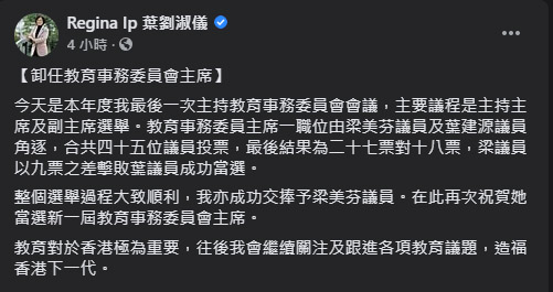 葉劉淑儀今日(16日)在社交平臺表示,自己已完成主持最後一次的教育事務(wù)委員會會議,並順利選出新一屆主席。她祝賀以9票之差獲勝的梁美芬議員當(dāng)選立法會教育事務(wù)委員會新主席。葉劉淑儀指教育對香港極為重要,所以她往後會繼續(xù)關(guān)注及跟進各項教育議題,造福香港下一代。