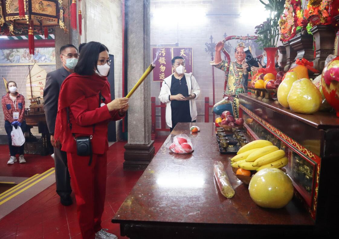 八和會館主席汪明荃今年3月到天后古廟參拜,並為戲班打氣。
