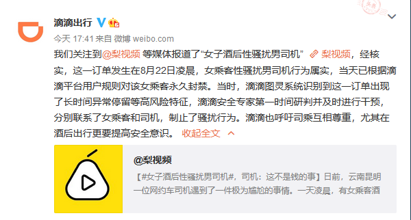 我們關(guān)注到@梨視頻等媒體報(bào)道了「女子酒後性騷擾男司機(jī)」梨視頻,經(jīng)核實(shí),這一訂單發(fā)生在8月22日淩晨,女乘客性騷擾男司機(jī)行為屬實(shí),當(dāng)天已根據(jù)滴滴平臺(tái)用戶規(guī)則對(duì)該女乘客永久封禁。當(dāng)時(shí),滴滴圖靈系統(tǒng)識(shí)別到這一訂單出現(xiàn)了長(zhǎng)時(shí)間異常停留等高風(fēng)險(xiǎn)特徵,滴滴安全專家第一時(shí)間研判並及時(shí)進(jìn)行干預(yù),分別聯(lián)繫了女乘客和司機(jī),制止了騷擾行為。滴滴也呼籲司乘互相尊重,尤其在酒後出行更要提高安全意識(shí)。