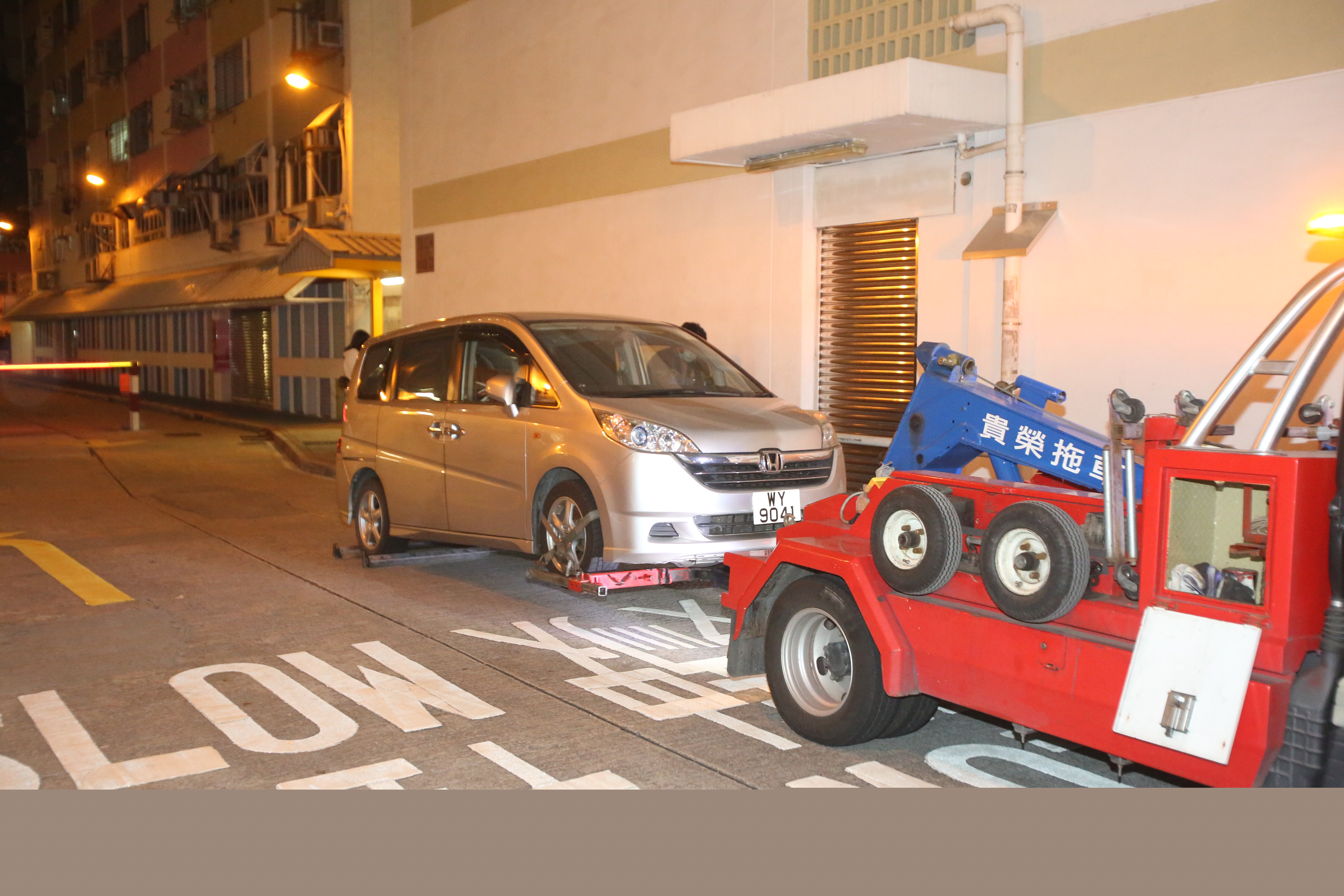 警方拖走涉嫌堵路七人車檢驗(yàn)。
