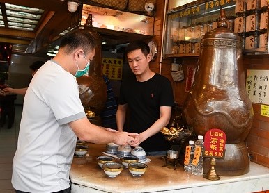 陳先生(白衫)是昔日街坊,幫襯「百寶堂」已三十多年,即使已搬離該區(qū),閒時(shí)還是會(huì)回來喝涼茶。