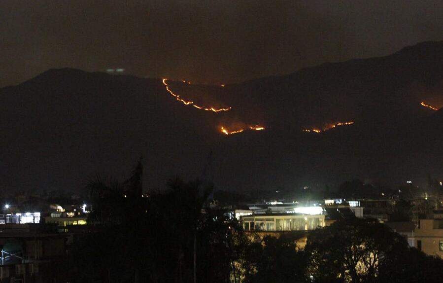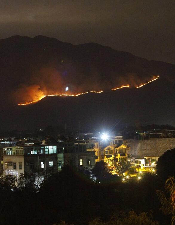 在錦田八鄉(xiāng)一帶山頭,至晚上仍有山火未撲滅,多條火龍?jiān)谏缴涎泳d不絕。