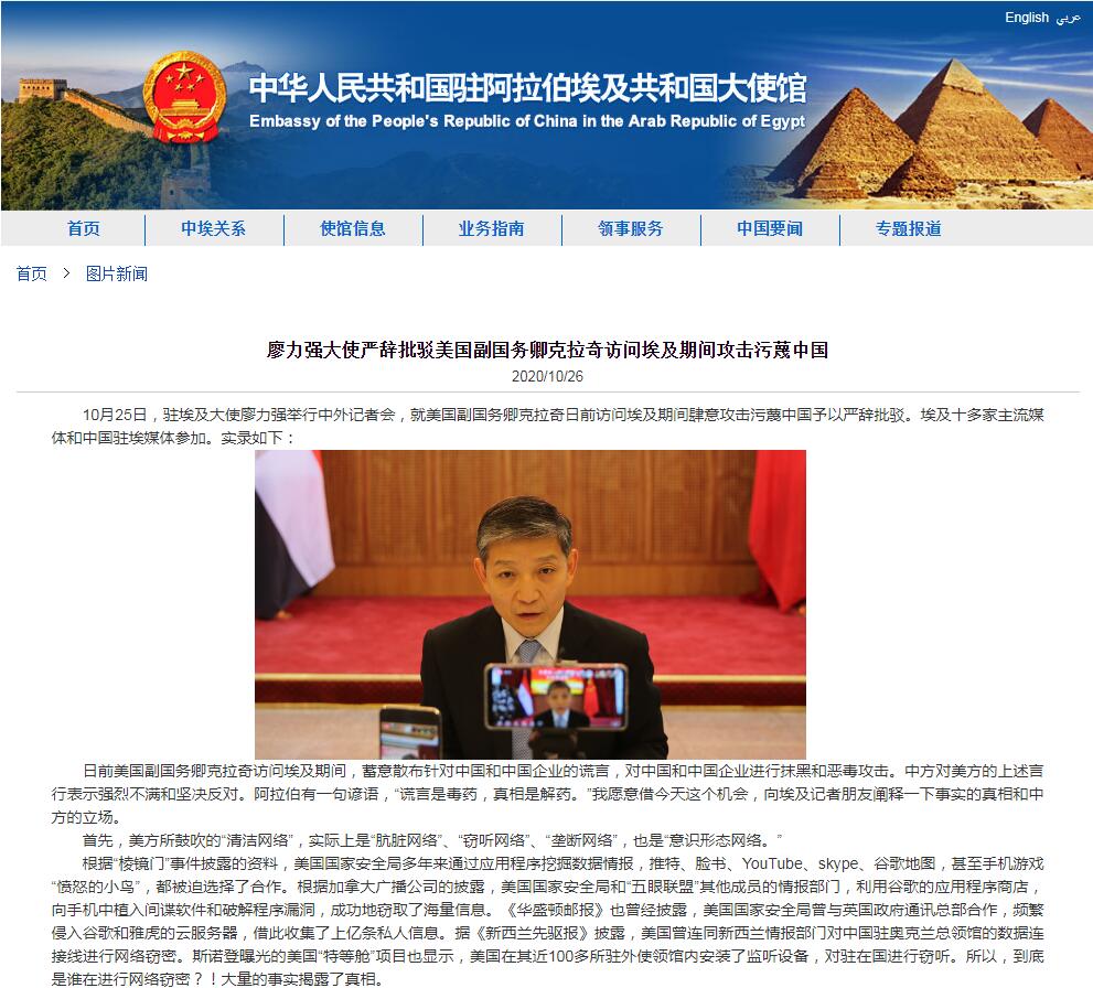 據(jù)中國駐埃及大使館網(wǎng)站消息,10月25日,駐埃及大使廖力強(qiáng)舉行中外記者會(huì),就美國副國務(wù)卿克拉奇日前訪問埃及期間肆意攻擊污衊中國予以嚴(yán)辭批駁。埃及十多家主流媒體和中國駐埃媒體參加。實(shí)錄如下: