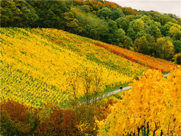 2020年10月25日,在德國西部波恩附近的小鎮(zhèn)科尼格斯溫特,秋色彌漫、層林盡染,觸目所見盡是鮮豔的金黃色。人們漫步在街區(qū)、葡萄園和山林,寂靜之中頗有幾分秋日勝春朝之感。(圖源:新華社)
