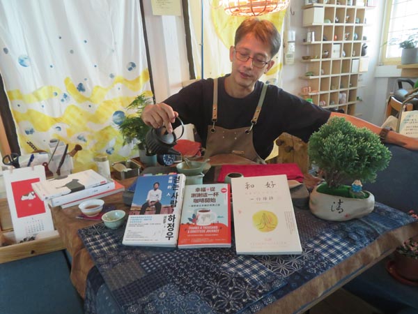 店主蔡刀以茶及咖啡招待來(lái)書(shū)窩的愛(ài)書(shū)人,前方為他推薦的3本書(shū)。記者 鄭玉君攝