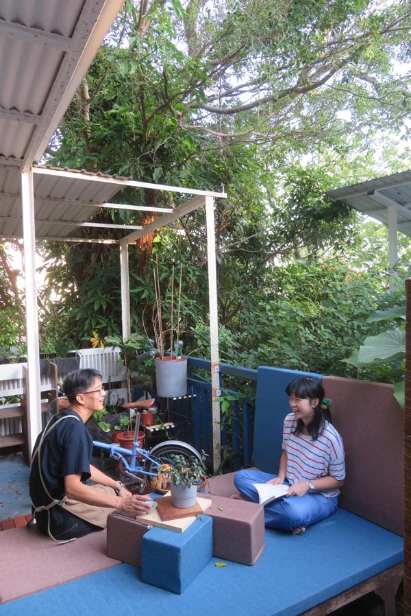 書(shū)窩有室外地方,可貼近大自然地與人交流,右為首訪書(shū)店客人F小姐,與蔡店主相談甚歡。
