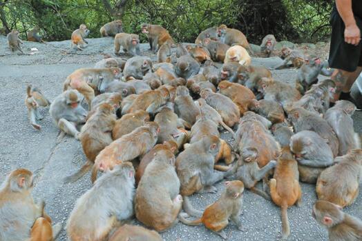 無論野外食物足夠與否,猴子經(jīng)歷長久以來的人工餵飼,已變得依賴人類,尤其遊人多的假日,牠們空群而出,特別在石梨貝水塘巴士站及附近的琵琶山路停車場,猴子在樹梢、欄桿、山坡、汽車頂?shù)鹊靥鴣硖?,伺機(jī)等待遊人拿出食物,當(dāng)發(fā)現(xiàn)時即跳出來拿走,繼而迅速在一旁啃食。等食的猴子各式各樣,有小猴、斷臂猴、母子猴(母猴背著BB猴),更多是青年猴。牠們機(jī)靈、活潑,覓食時模樣專注,得到時一臉陶醉,這種展露真性情的憨態(tài)惹人喜愛。