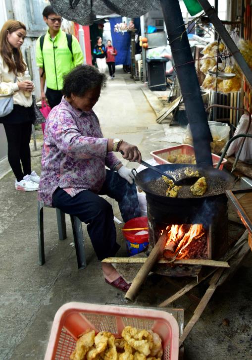 有漁民婦女在門前路邊起爐架鑊,把赤魚膠爆炒成魚肚出售吸引了遊人圍觀購買。爆魚肚是漁民傳統(tǒng)做法,目的是要其膨脹鬆脆,浸水發(fā)大後可煮成豬皮口感般的軟滑魚肚。過去曾以油炸久放易有變壞的油膉味,故現(xiàn)以鹽爆加工,只要火勢控制得宜,每一兩分鐘翻炒一次約20分鐘便可完成。蜑家人和客家人都十分喜愛吃由門鱔魚鰾爆成的鱔肚,因為其可吸收別的食材汁液增加美味,加上入口軟滑故老幼咸宜。過去有大澳漁民愛在大風浪中以延繩排專釣門鱔。