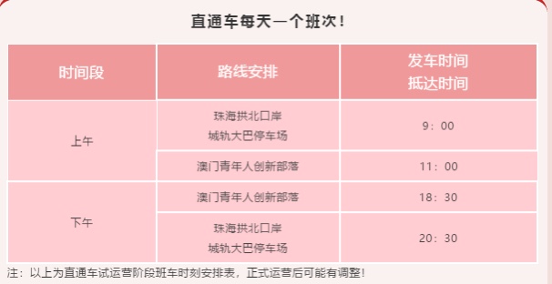 3月30日,灣區(qū)首創(chuàng)的粵澳直通車在黃埔發(fā)車,每天一個(gè)班次,上午9:00發(fā)車,從珠海拱北口岸直達(dá)位於黃埔區(qū)的澳門青年人創(chuàng)新部落,並於下午18:30從澳門青年人創(chuàng)新部落返回拱北口岸,全程僅需兩小時(shí),面向普通市民開放,將為頻繁往返穗澳兩地的商務(wù)人士提供交通便利。
