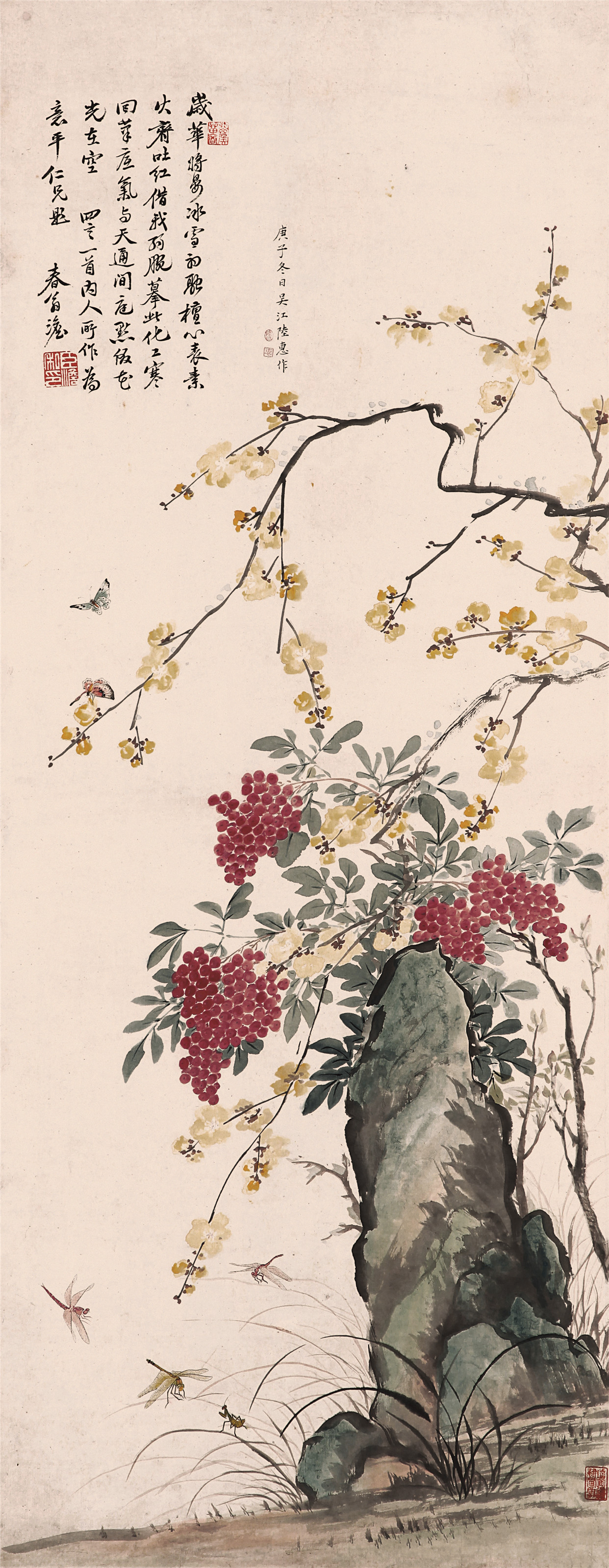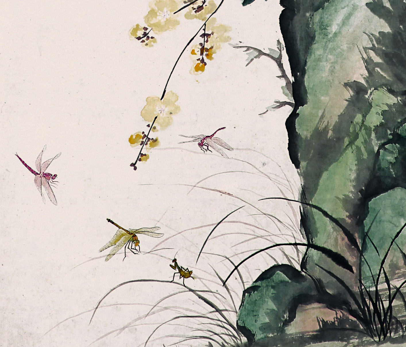 《天竹臘梅圖》乃陸惠作畫,張澹題跋,畫秀字雅,是這對神仙眷侶完美契合的最佳佐證。圖中一叢紅天竹與淡黃的臘梅交錯於奇石旁,色澤清麗,筆致工細(xì),畫面左下方幾隻工筆繪成的蜻蜓飛舞於草葉間,情態(tài)各異,栩栩如生,與上端的蝴蝶遙相呼應(yīng),為畫面增添一抹生動的意趣。天竹是觀果佳品,因其能在冰天雪地中經(jīng)久不凋,因此與水仙、臘梅並稱「歲寒三友」,寓意吉祥、好運(yùn)、健康長壽。臘梅耐寒,淩寒獨自開,寓意獨立堅貞的高潔品質(zhì)。天竹果枝與盛開的臘梅最為搭配,黃花紅果,色彩鮮麗,置於書院中,清香四溢,既適宜觀賞,又能靜心養(yǎng)氣,展現(xiàn)文人淩霜傲雪的風(fēng)骨。