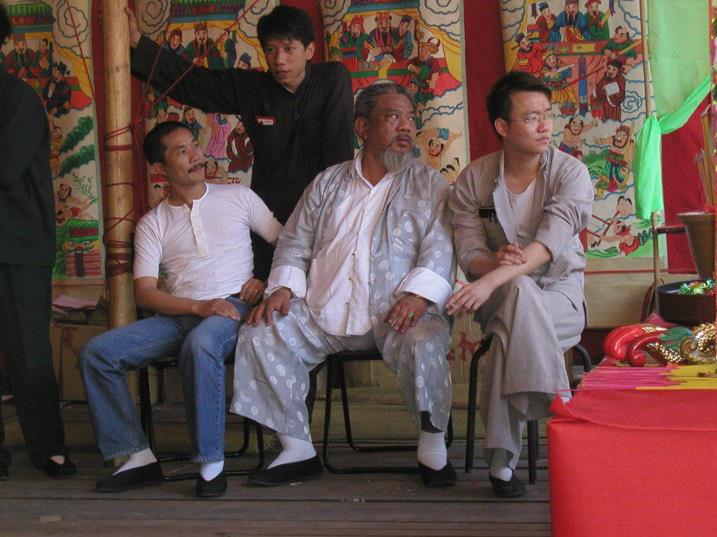 筆者2005年在沙田九約醮場偷拍梁師傅,因覺得他很有「霸氣」。圖左是其師兄弟「寶叔」、右是其徒阿忠,背後是長子嘉樂。