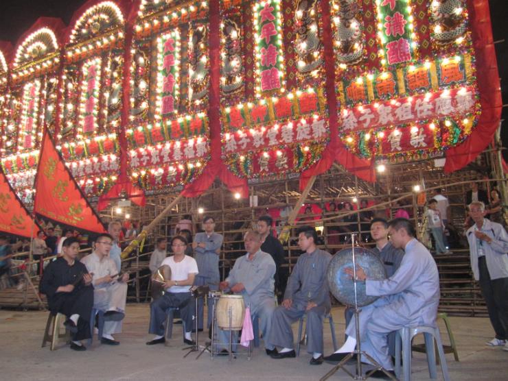 2012年八鄉(xiāng)蓮花地打醮,梁仲師傅率領(lǐng)一眾徒子徒孫露天演奏。周樹佳提供圖片