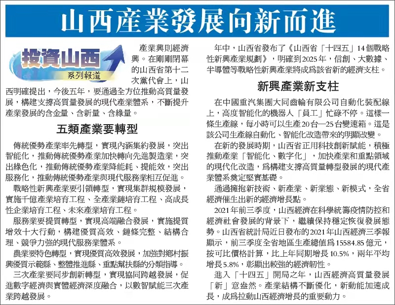 進(jìn)入「十四五」開局之年,山西經(jīng)濟(jì)高質(zhì)量發(fā)展「新」意盎然。產(chǎn)業(yè)結(jié)構(gòu)不斷優(yōu)化,新動(dòng)能加速成長,成為拉動(dòng)山西經(jīng)濟(jì)增長的重要?jiǎng)恿Α?strong>(王利萍)