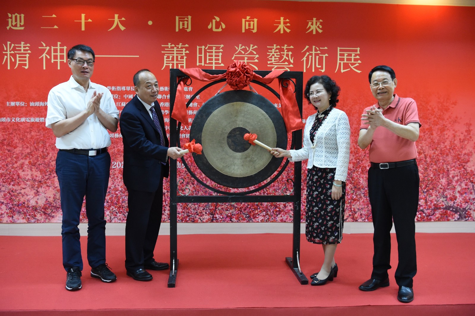 蕭暉榮(右一)、中國文聯(lián)港澳臺辦公室主任董占順(左二)、廣東省文聯(lián)黨組書記王曉(右二)、汕頭市政協(xié)第十三屆主席謝澤生(左一)為畫展鳴鑼揭幕。