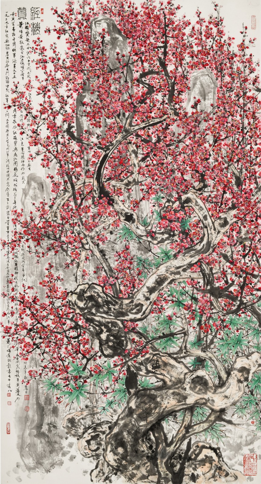 蕭暉榮作品《梅花三弄之紅梅贊》,設色紙本,153x83cm,2022年。