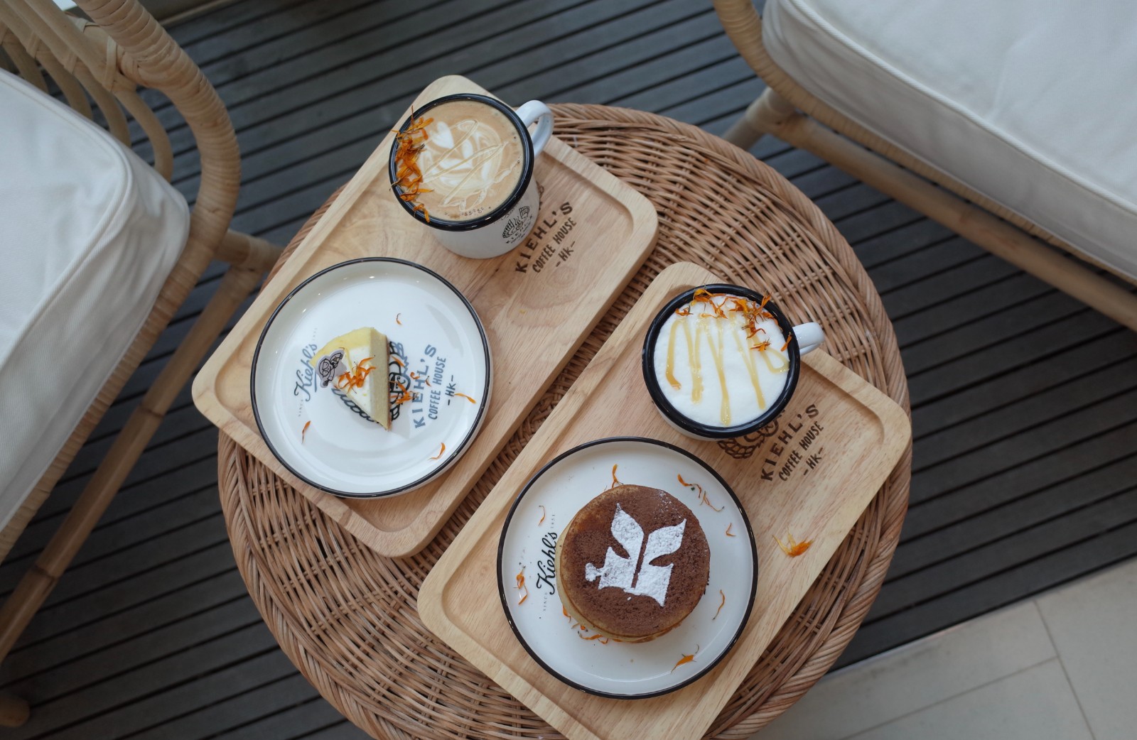 金盞花麥蘆卡蜂蜜鮮奶咖啡,HK$58(熱),HK$62(凍)。金盞花紐約芝士蛋糕,HK$50。金盞花咖啡牛油班戟,HK$118。