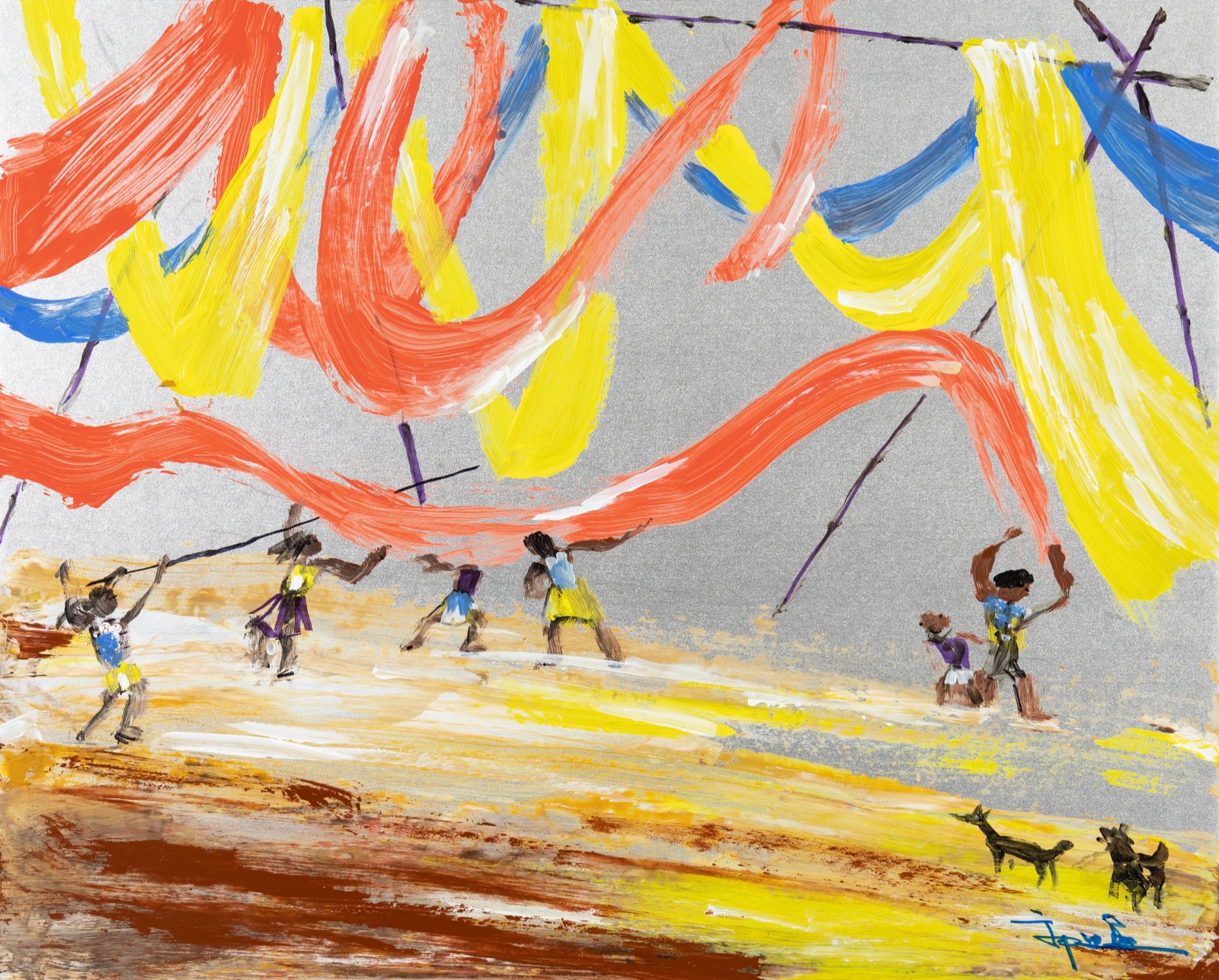 《樂》的畫面色彩鮮豔明麗,金色的陽光穿過彩帶灑落在地面,人們迎著光,高揚的手臂表達出歡快與喜悅。人物的描繪簡略生動,寥寥幾筆表現(xiàn)出人物的動作與情感,每個人物的衣著各不相同,在細(xì)節(jié)上十分豐富。彩帶迎風(fēng)飄揚,象徵著輕鬆愉快的心情,明亮的色調(diào)也渲染出生活的多姿多彩。勞作中充滿了辛勤的汗水,但也蘊含著生活的真諦,付出的辛勞與收穫的喜悅為生活增添了亮麗的光彩。