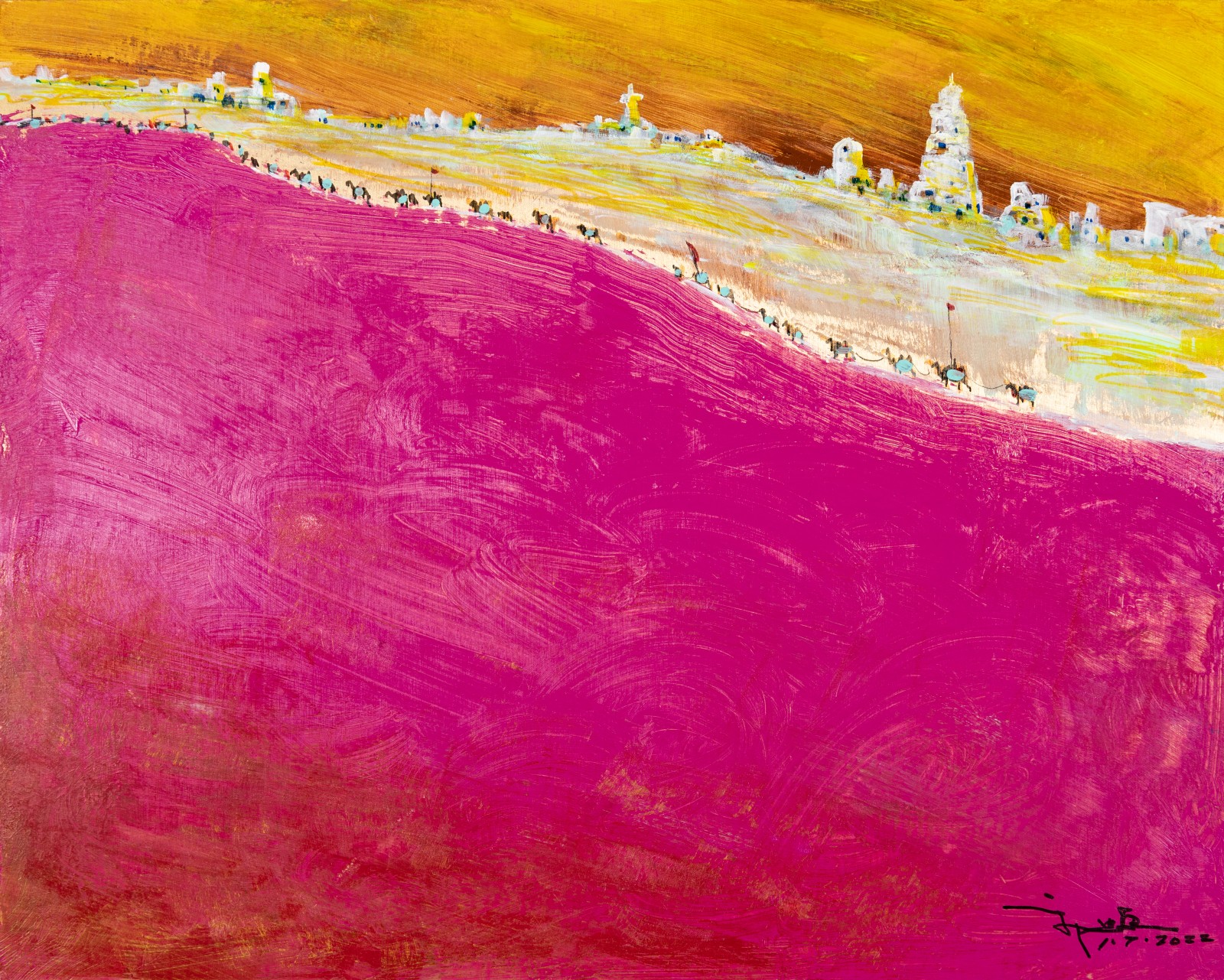 郭迪康在《紅色的沙漠》中描繪商隊穿行在沙漠中的情景。他用色大膽凝練,畫面以三個色塊組成:遠(yuǎn)處的沙丘是流動的橘黃色,中間是淺色的綠洲與建築,在陽光下呈現(xiàn)出炫目的光彩,近處是大面積的紅色沙漠,商隊的駱駝行走在紅色的沙丘上,彷彿色塊的分界線。在此作中,沙漠不再是黃沙漫天的模樣,光線的角度將沙丘分隔成了兩個部分,迎光的一面是溫暖的橘黃色,而背光的部分則呈瑰麗的玫紅色。筆觸的形狀與方向看似雜亂無章,但亂中有序,沙漠的顆粒感與流動感通過筆觸的方向表現(xiàn)出來,令這佔據(jù)畫面大半的色塊擁有豐富的細(xì)節(jié)。