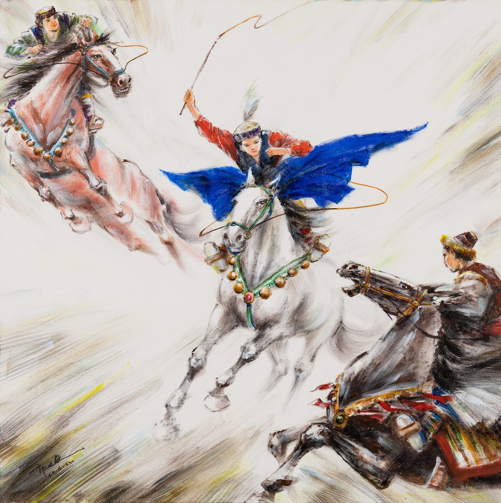 郭迪康的作品《神馬》描繪了遊牧民族的賽馬活動,為觀眾展現(xiàn)了濃郁的民族風(fēng)情。畫面中央的紅衣女子手執(zhí)長鞭,策馬奔騰,左側(cè)的男子騎著一匹紅色駿馬騰空而起,向女子躍去,右側(cè)的騎手正勒馬後仰,彷彿阻攔不住紅衣女子的氣勢,向一側(cè)避開。