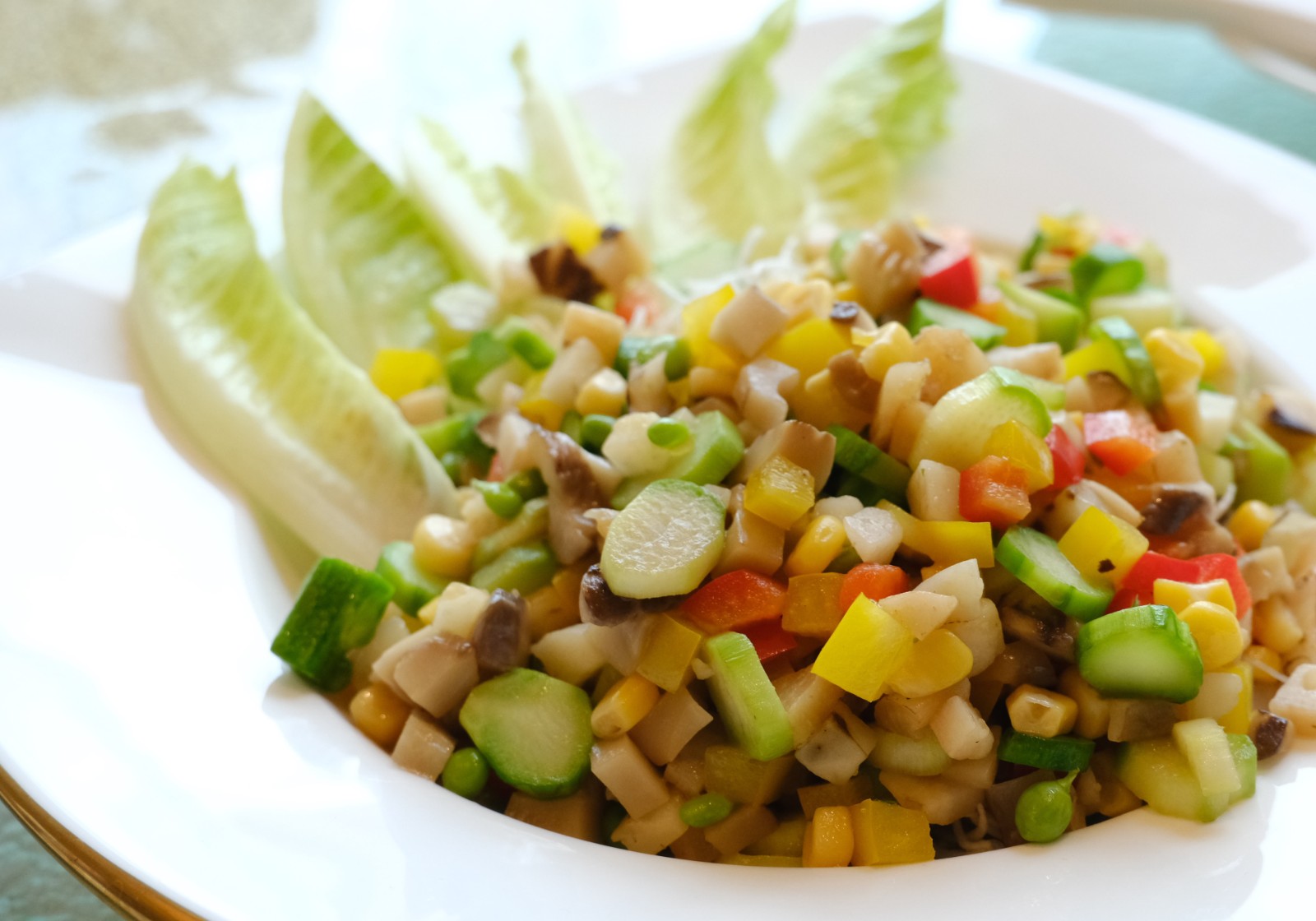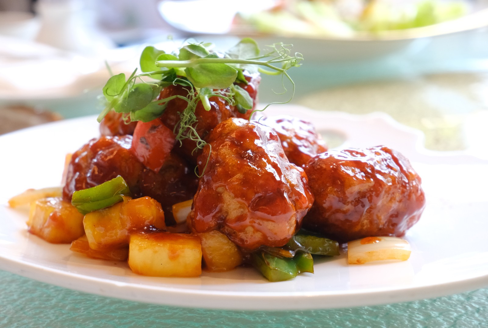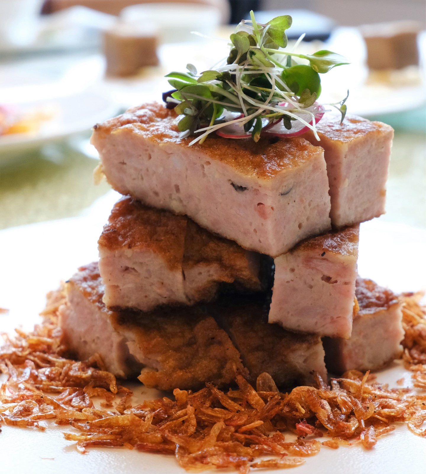 菜式中包含不少下飯菜,曾獲旅發(fā)局「美食之最大賞」的得獎(jiǎng)名饌香煎櫻花蝦黑豚肉餅(HK$288),選用日本章魚、馬蹄粒、冬茹粒、芫西粒等材料搭配嫩口的黑豚肉,將蒸肉餅的煮法改為煎,最後撒上香脆可口的櫻花蝦,甚為惹味。古法鳳梨咕嚕肉(HK$288元)同樣別於坊間傳統(tǒng),咕嚕肉製成卷狀,炸至金黃,造型趣致亦易入口,外脆內(nèi)腍,酸甜醬汁令人不禁一口接一口。素食者可一嘗色彩斑斕的八寶素菜粒脆脆(HK$238),創(chuàng)作靈感來自泰國生菜包,超過10款的新鮮蔬菜,包括蘆筍、芥蘭、菜脯、唐豆、玉米、甘筍、蓮藕、馬蹄等,配上羅馬生菜,看似平凡,切得粒粒平均的蔬菜考驗(yàn)廚師刀功,口感與營養(yǎng)價(jià)值亦非常豐富。