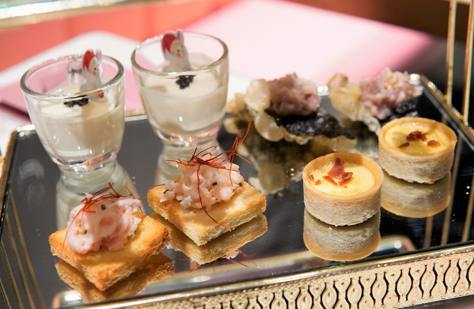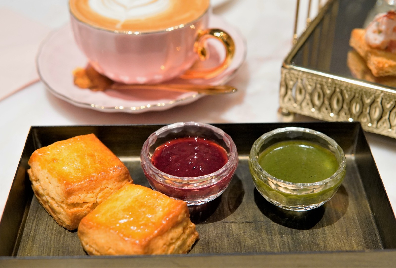 下午茶的鹹點(diǎn)有明太子蝦多士、煙肉黑松露蛋撻、魚子醬芹菜頭奶凍、芝麻吞拿魚蓉配紫菜脆片及英式鬆餅配草苺果醬及綠茶白朱古力醬。