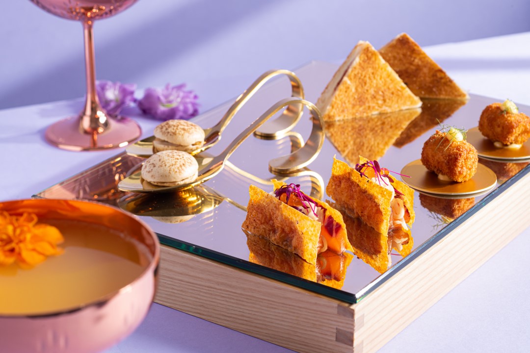餐廳總廚James Oakley為「紫綴金炫」煥肌下午茶套餐設(shè)計(jì)了多款可口小食,先以紫甘藍(lán)醃三文魚(yú)配西芹頭沙律及烤薄脆餅乾掀開(kāi)序幕,從紫甘藍(lán)的天然色素取其紫色,再以?shī)A心三層的方式設(shè)計(jì)。外形像一朵蘑菇的森林蘑菇馬卡龍,配上香氣滿溢的野菌醬汁,味道有驚喜。炸至金黃香脆的加拿大龍蝦可樂(lè)餅,鮮味彈牙,而白毛豬火腿曼徹格芝士多士烘得酥脆可口。