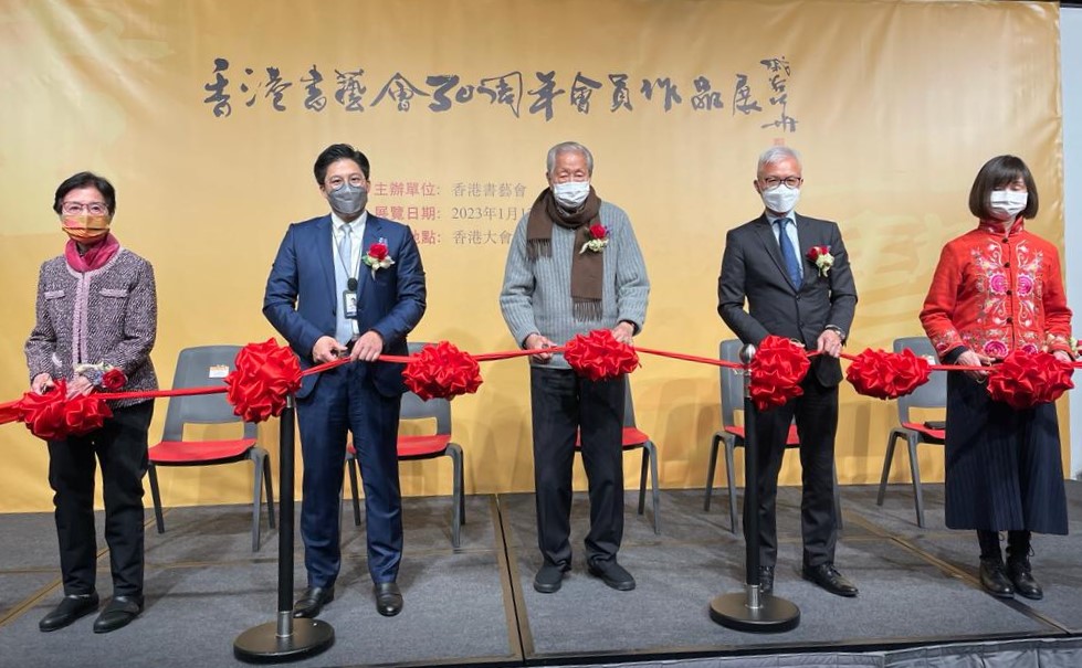 立法會議員霍啟剛(左二)、中國書法協(xié)會顧問施子清(左三)、香港故宮文化博物館館長吳志華(右二)、香港書藝會會長戚谷華(左一)及主席梁鎂清(右一)參與展覽的開幕典禮。