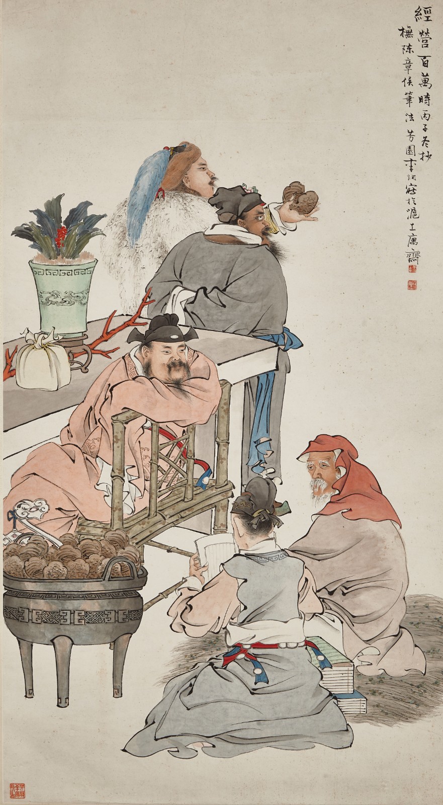 畫(huà)中人物神態(tài)生動(dòng)細(xì)緻,鬚髮纖毫畢現(xiàn)。衣紋線條簡(jiǎn)練、勾寫(xiě)有力,起筆多頓點(diǎn),用富有裝飾性的釘頭鼠尾描形成了節(jié)奏韻律。圓鼎上的複雜紋理以細(xì)筆刻畫(huà),一絲不茍,竹椅的斑駁質(zhì)感也以墨點(diǎn)繪製出來(lái),呈現(xiàn)出畫(huà)家精湛純熟的功力。用色上近似任伯年的明淨(jìng)淡雅,但色調(diào)更顯沉厚,頗有古樸蒼勁之感。桌上盆栽以沒(méi)骨畫(huà)法為主,淡墨層層暈染,表現(xiàn)出葉片的柔韌感,樹(shù)枝以水墨雙勾,填以朱紅色,筆法灑脫,渾然天成。