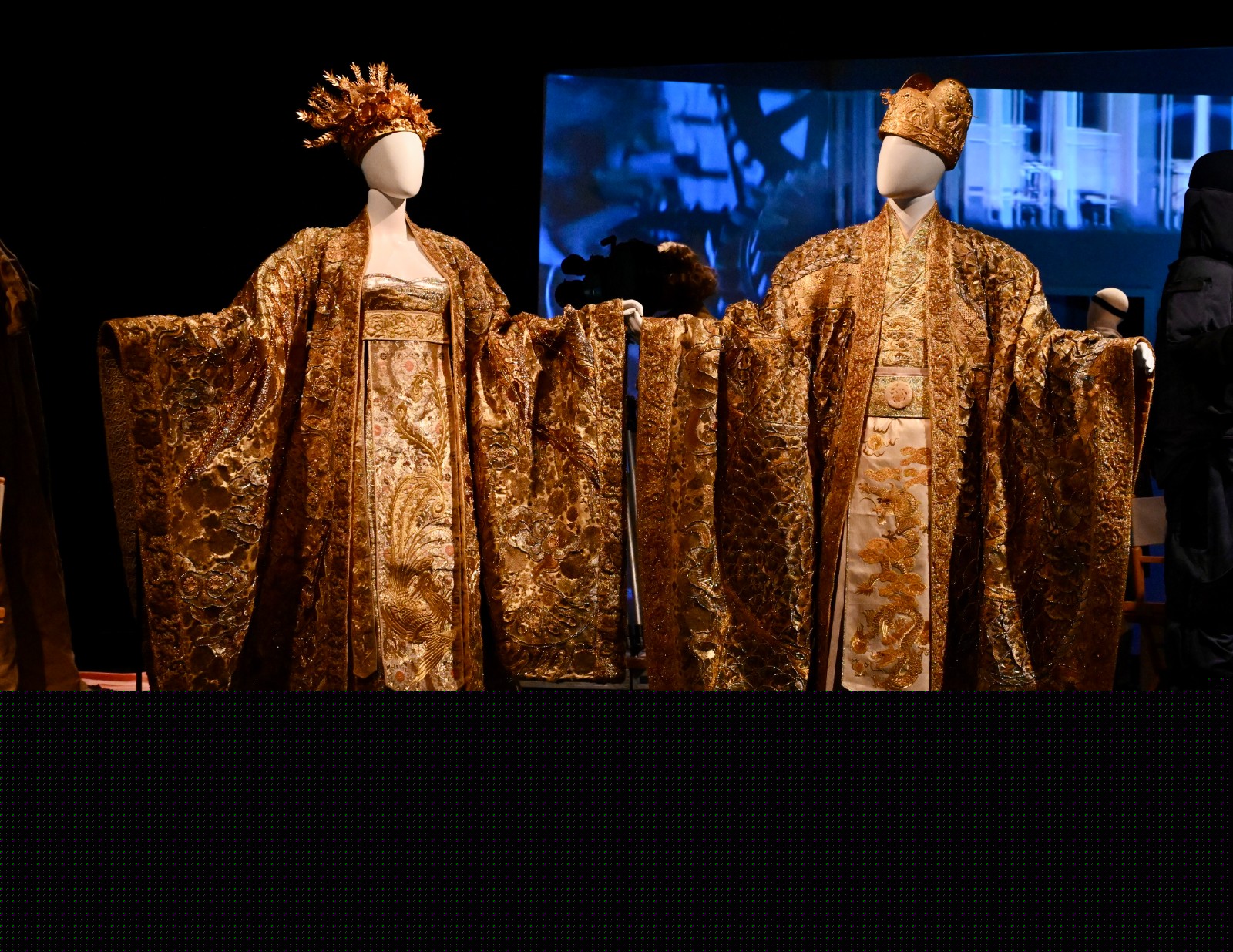 電影中每一套戲服,均由美術(shù)指導(dǎo)度身為角色設(shè)計(jì),打造出獨(dú)一無(wú)二的造型。2006年,周潤(rùn)發(fā)與鞏俐合演的 《滿城盡帶黃金甲》以晚唐作背景, 講述了一場(chǎng)牽涉權(quán)力情慾的鬥爭(zhēng)。戲中出現(xiàn)的兩套金黃織錦龍鳳大朝服, 是今次展覽的重點(diǎn)展品,服裝繡上繁複的龍鳳和團(tuán)花圖案,顯出身份尊貴、氣度不凡;戲服並加入大量珠片 及立體雷射合金片,突出金光燦爛的視覺(jué)效果,盡顯豪華闊氣的姿態(tài)。