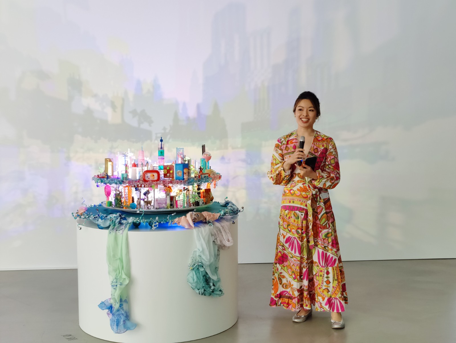 藝術(shù)家李寶怡及其作品《鳥(niǎo)語(yǔ).花香》,展品加入擴(kuò)增實(shí)境元素。(Susan攝)