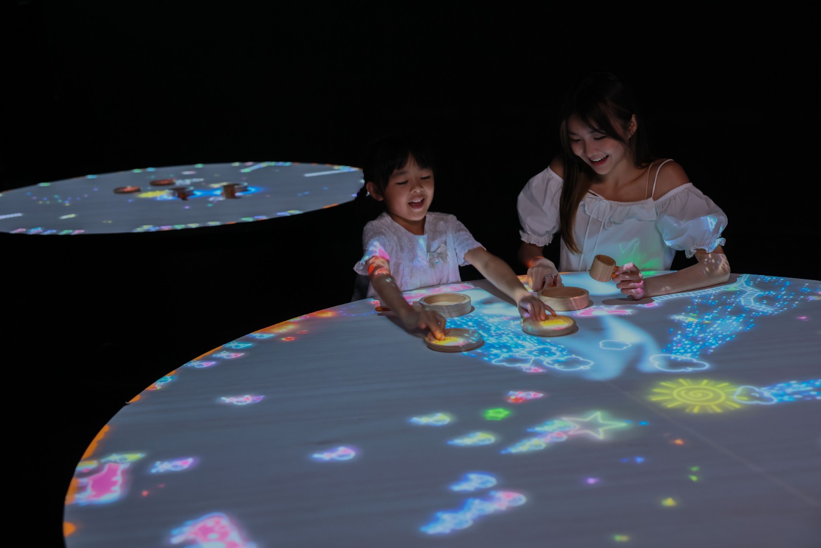 「彩繪城鎮(zhèn)」的建築、汽車、不明飛行物和宇宙飛船等由觀者在紙上繪畫成投影影像,並能進(jìn)行互動(dòng),適合親子參與。