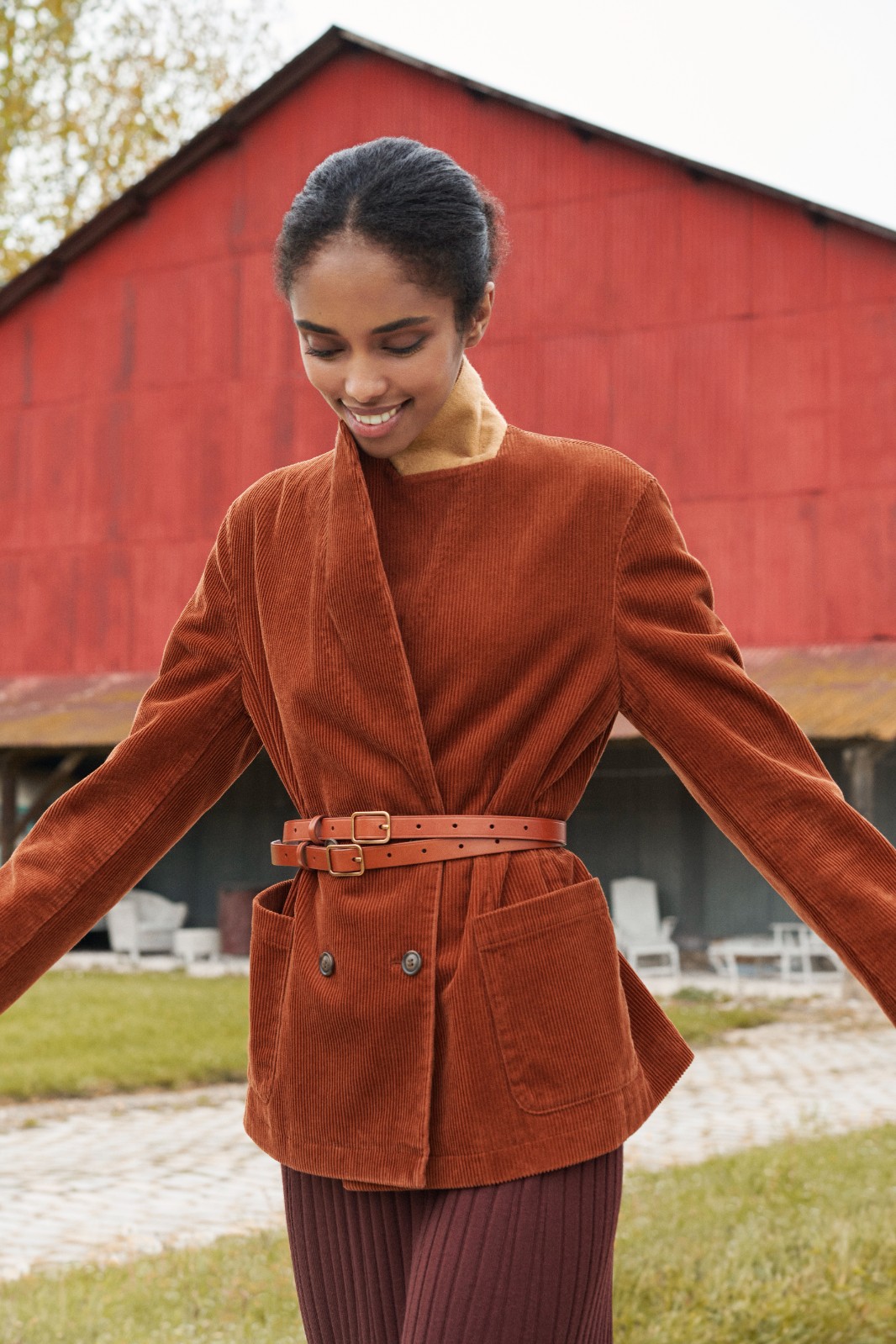 IDLF燈芯絨雙排釦外套,HK$599。IDLF皮帶,HK$199。正統(tǒng)款式外套由於採(cǎi)用寬版設(shè)計(jì)及柔軟加工的棉質(zhì)燈芯絨物料,可穿出休閒感。背部及袖的內(nèi)裏採(cǎi)用原創(chuàng)格紋花色設(shè)計(jì),可捲袖口。