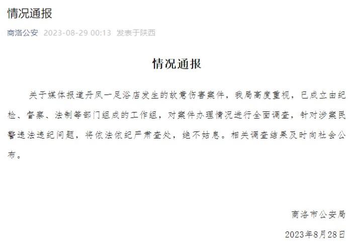近日,「陝西商洛車管所一民警酒後在足浴店毆打殘疾工作人員」一事引發(fā)網(wǎng)友廣泛關(guān)注。對此,商洛市公安局29日在官方微信公眾號發(fā)布情況通報稱,關(guān)於媒體報道丹鳳一足浴店發(fā)生的故意傷害案件,商洛市公安局高度重視,已成立由紀檢、督察、法制等部門組成的工作組,對案件辦理情況進行全面調(diào)查,針對涉案民警違法違紀問題,將依法依紀嚴肅查處,絕不姑息。相關(guān)調(diào)查結(jié)果及時向社會公布。